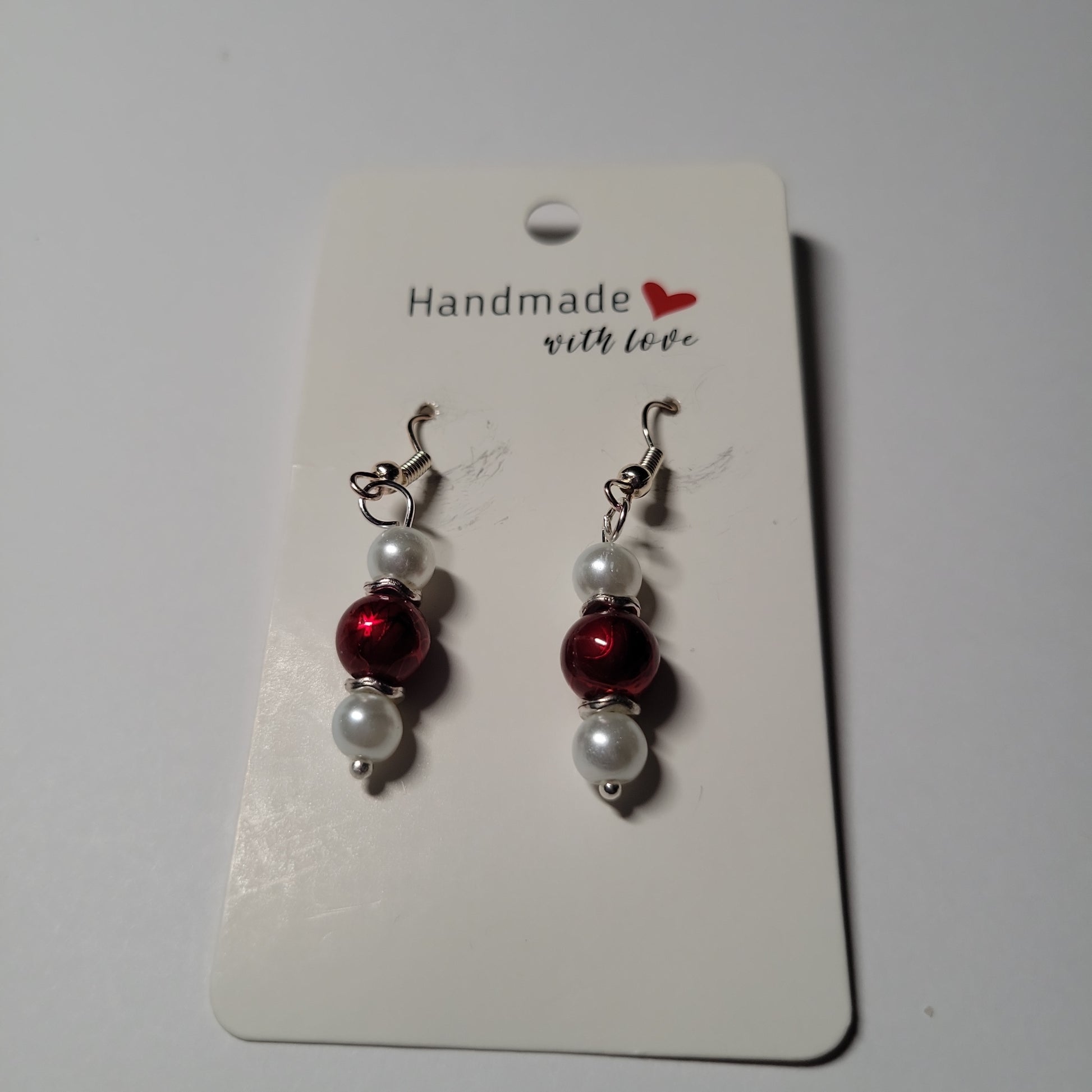 Red and pearl glass beads with silver tone spacers.